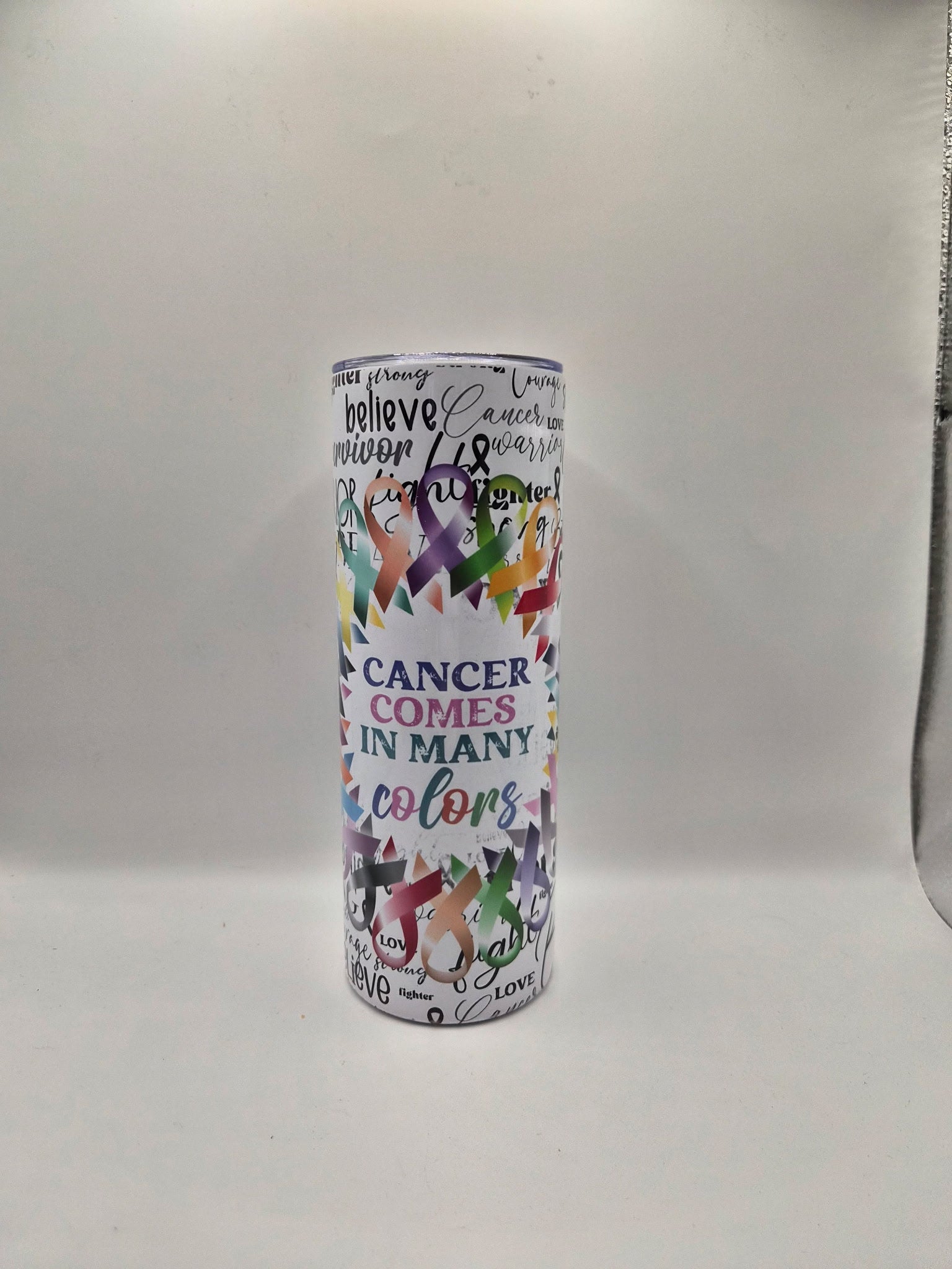 This 20oz stainless steel awareness tumbler features a beautiful ribbon collage paired with inspiring words like believe, hope, love, and warrior. It’s a meaningful way to honour a loved one, support someone battling cancer, or celebrate survivors.